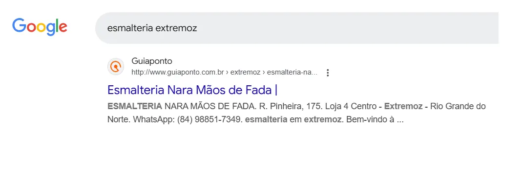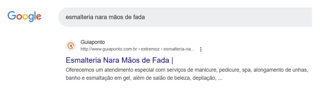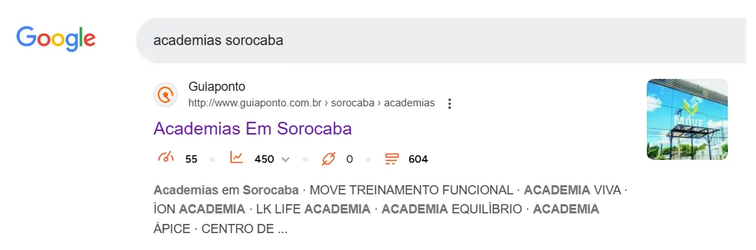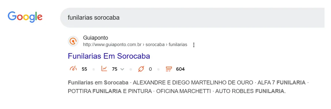 Nesta palavra-chave, foi alcançado a 1ª. Posição na rede de pesquisa Google, um dos fatores determinantes é a autoridade de domínio Guiaponto DA 55+. Se a empresa não possui um site, pode usar promover este link como sua página de vendas. Caso tenha um site, pode utilizar o sistema como um backlink apontando para o site cadastrado.